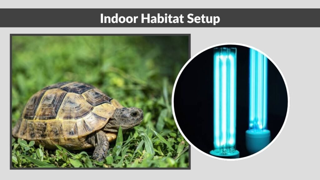 Lighting is critical indoors. UVB lighting must be provided daily to help the tortoise process calcium and maintain a strong shell. A basking lamp should also be installed to create a warm area where the tortoise can regulate its body temperature.
