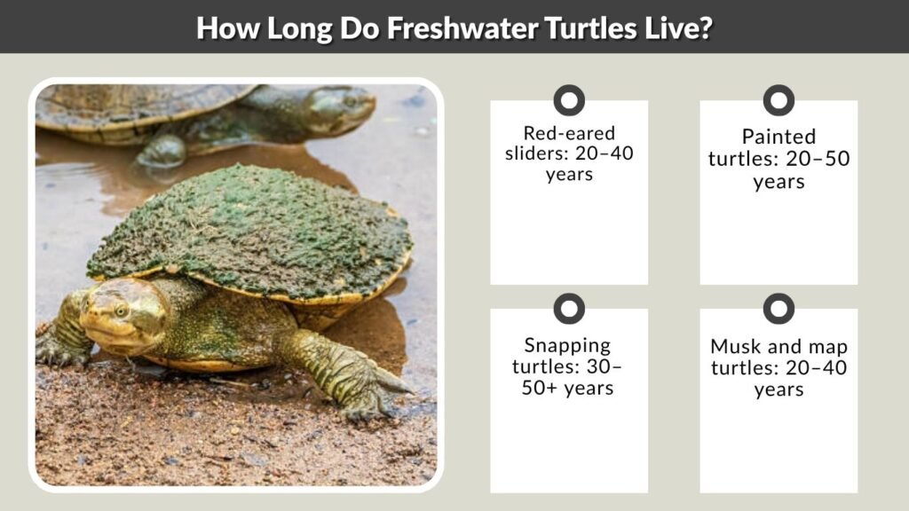 Freshwater turtles have moderate to long lifespans, especially when compared to many other reptiles. Their lifespan depends on species, habitat quality, and access to food. In the wild, they may face threats such as predators, pollution, and habitat destruction, which can affect how long they live.